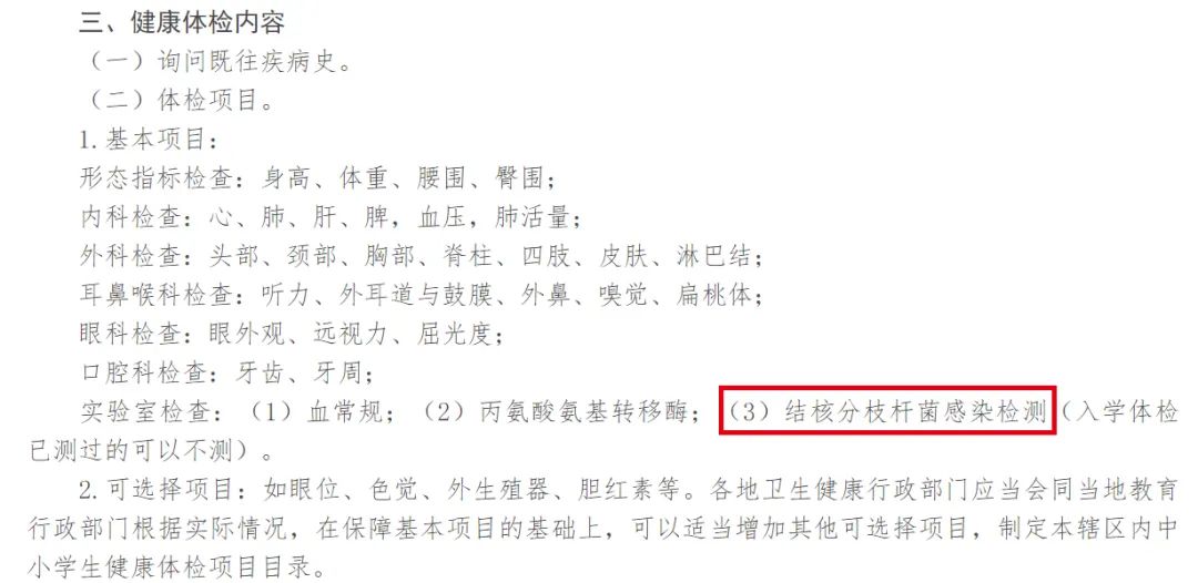 《辦法》明確規(guī)定學(xué)生健康檢查基本項(xiàng)目(也就是必檢項(xiàng)目),包括形態(tài)指標(biāo)檢查、內(nèi)科、外科、耳鼻、眼科、口腔科,以及血常規(guī)檢查、丙氨酸氨基轉(zhuǎn)移酶以及結(jié)核分枝桿菌感染檢測??梢钥闯?,《辦法》針對結(jié)核病防控提出了更高的要求: